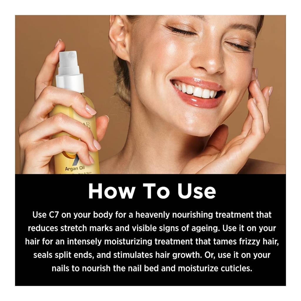 Use C7 on your body for a heavenly nourishing treatment that reduces stretch marks and visible signs of ageing. Use it on your nails to nourish the nail bed and moisturize cuticles.