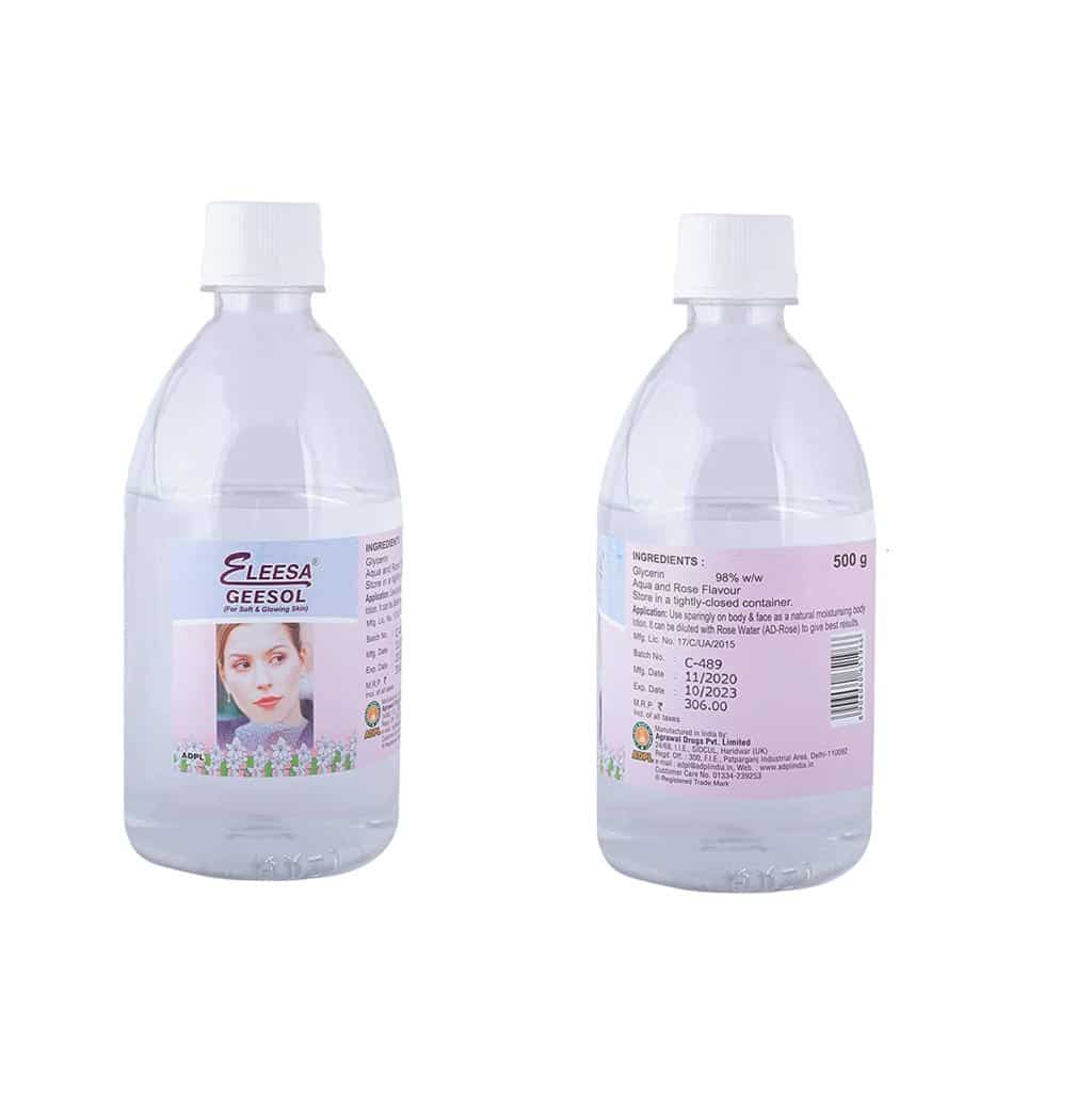 Elessa Geesol Glycerin, 500g, (Oral Solution USP) Glycerin has an impressive number of health benefits, including the ability to moisturize the skin, clean the intestines, accelerate healing, retain water, protect the immune system and contribute to anti-aging efforts.