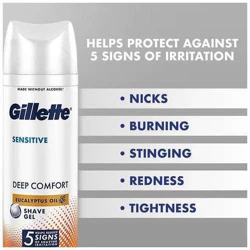 Gillette Sensitive Deep Comfort Shave Gel is completely free of dyes, parabens and sulfates. Infused with aloe vera, it helps your razor glide smoothly over your skin. The specially designed formula will help protect skin against irritation during the shave while lightly cooling and soothing skin. Suitable for sensitive skin, you can experience dramatically soft skin with every shave.