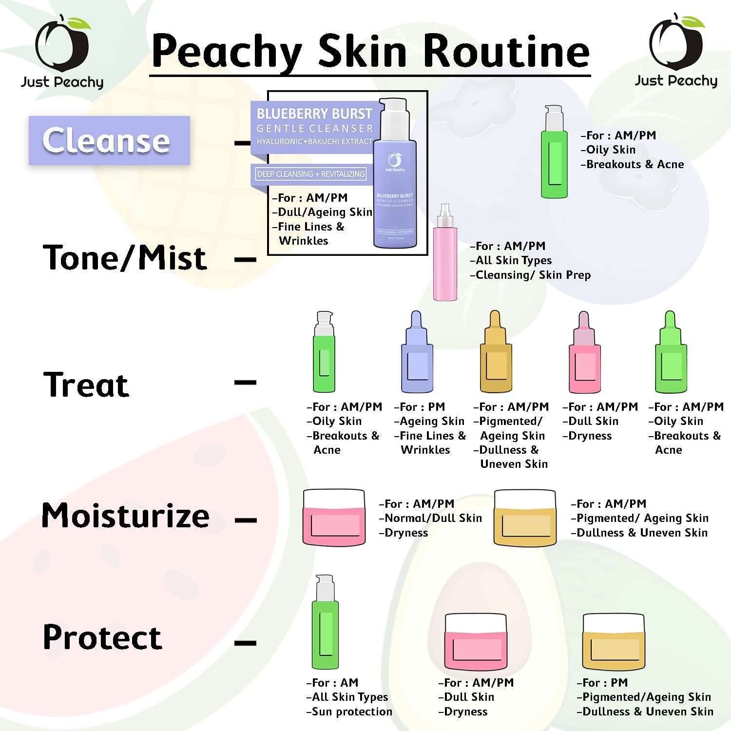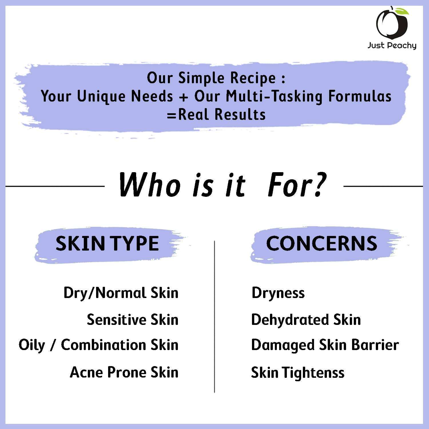 Just Peachy Skincare aims to provide an easy and effective way to resolve your skin concerns. Backed by science and with the goodness of fruits on our side; We take a deep dive into everything skin science, understand the needs of individual skin types and formulate solutions for your dear skin concerns. <br> <b>Our Simple Recipe: