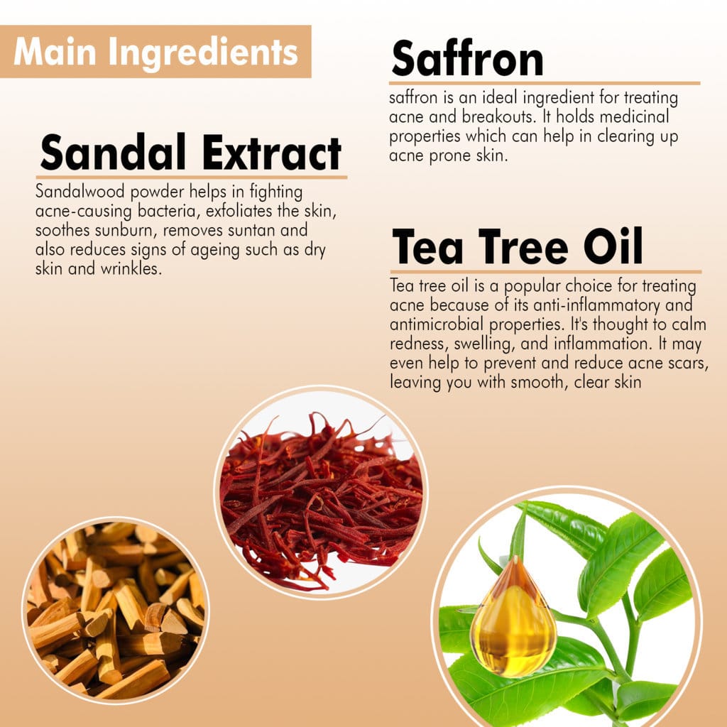 Sandalwood, Saffron, Vitamin E, Teatree oil, Almond Oil