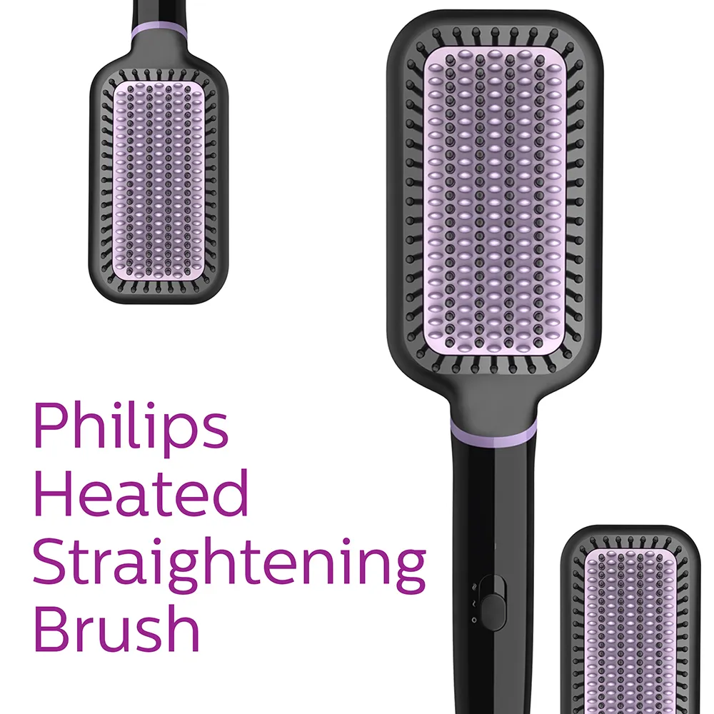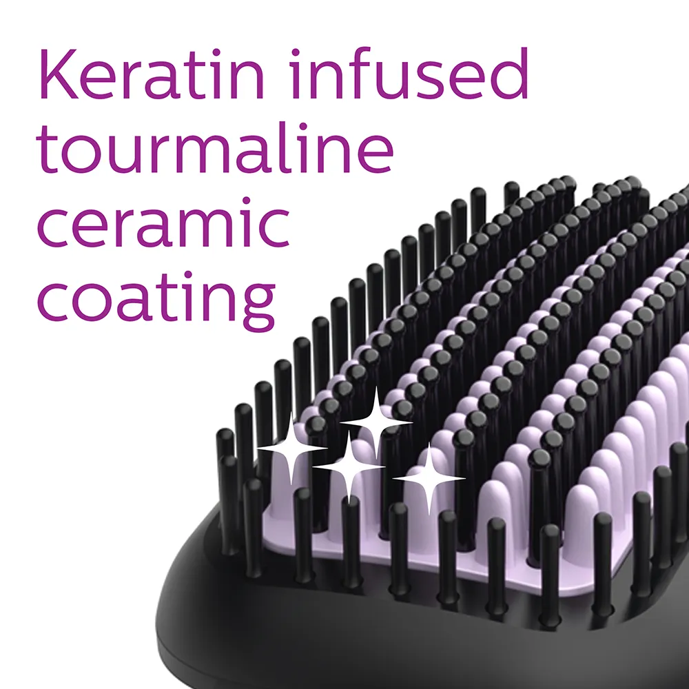 Reveal naturally straight and shiny hair in just 5 minutes! Philips Heated Brush with ThermoProtect technology BHH880/10 features a triple bristle design with keratin infused ceramic coating. While the bristles glide smoothly through your hair and gently detangle and straighten, they also protect your scalp from heat. The ThermoProtect technology keeps the temperature optimized to minimize the heat damage and reduce friction, leaving your hair looking silky straight.