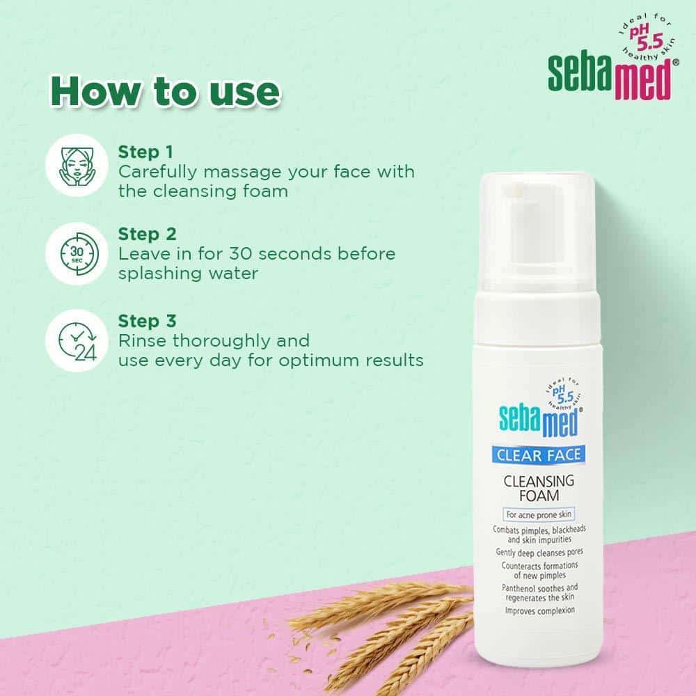 Sebamed clear face foam 150ml is an anti-bacterial cleansing foam that fights pimples, blackheads and skin impurities gently and effectively. It protects against skin barrier damage during cleansing, leaving skin smooth and hydrated. Made with pro-vitamin B5, it is apt for acne prone skin and improves complexion, deep cleanses pores with Montaline C40, a coconut oil derivative. Skin care routine starts with cleansing which is first and the most important step. Sebamed Clear Face Cleansing Foam actively works on giving your skin deep cleansing.