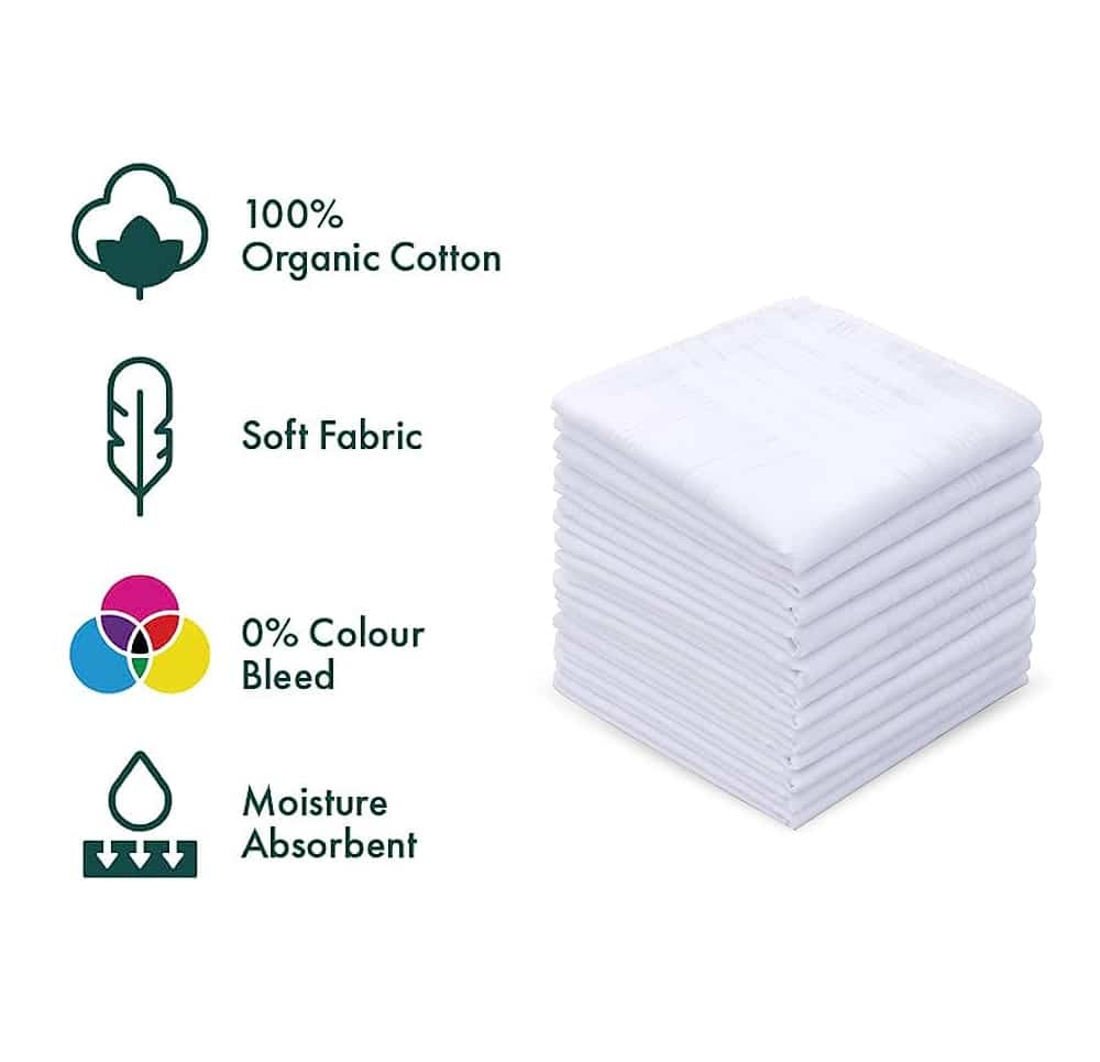 White color handkerchief adds decent look to the hankies. Package content: pack of 12. Mens Cotton white Handkerchiefs. Premium range with super soft cotton. Super skin friendly and Anti Allergic. White Handkerchiefs for men with thin color lines at the end. Package contains Premium range 6 Hankies from SimplyCraft for Office, Party.